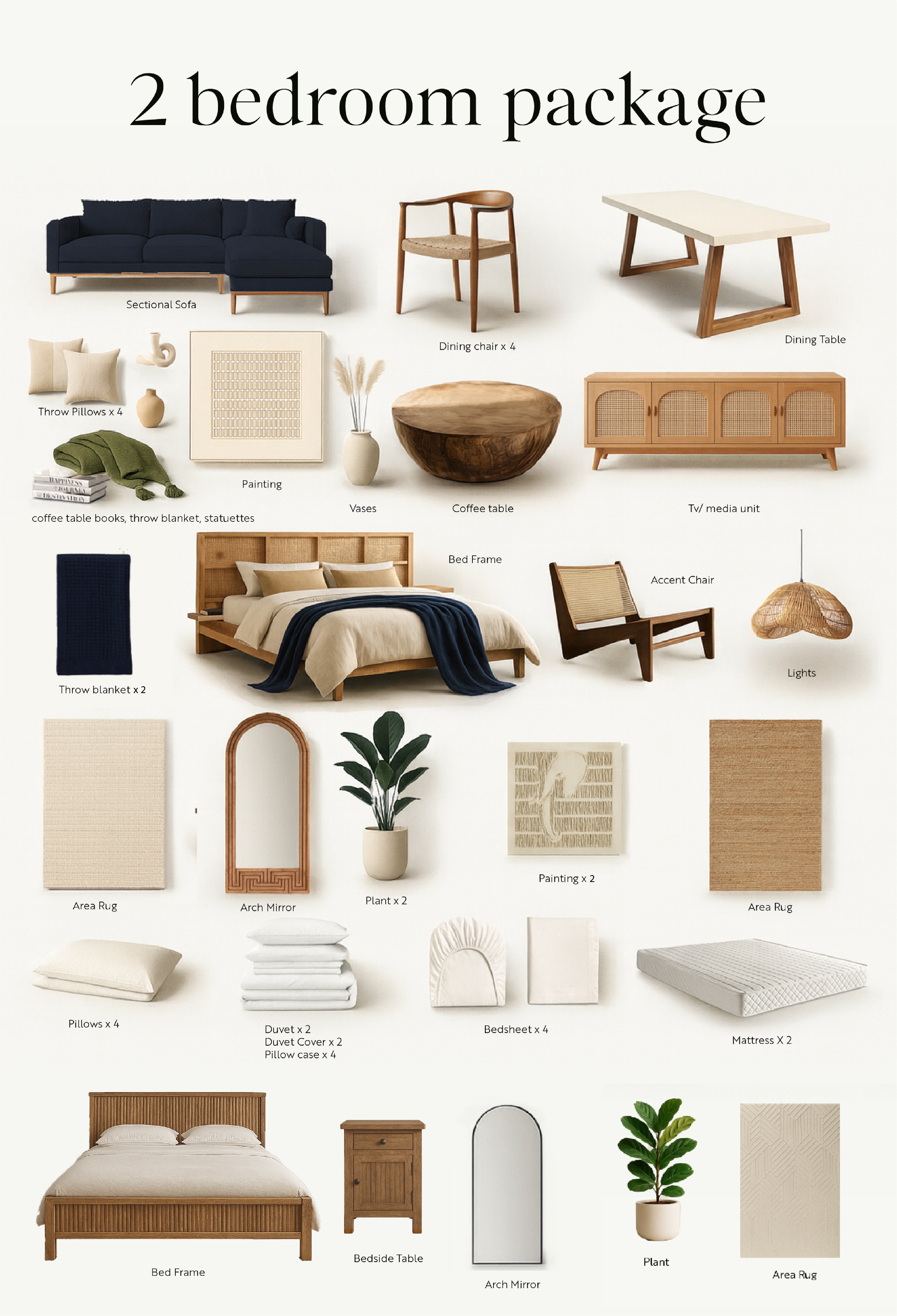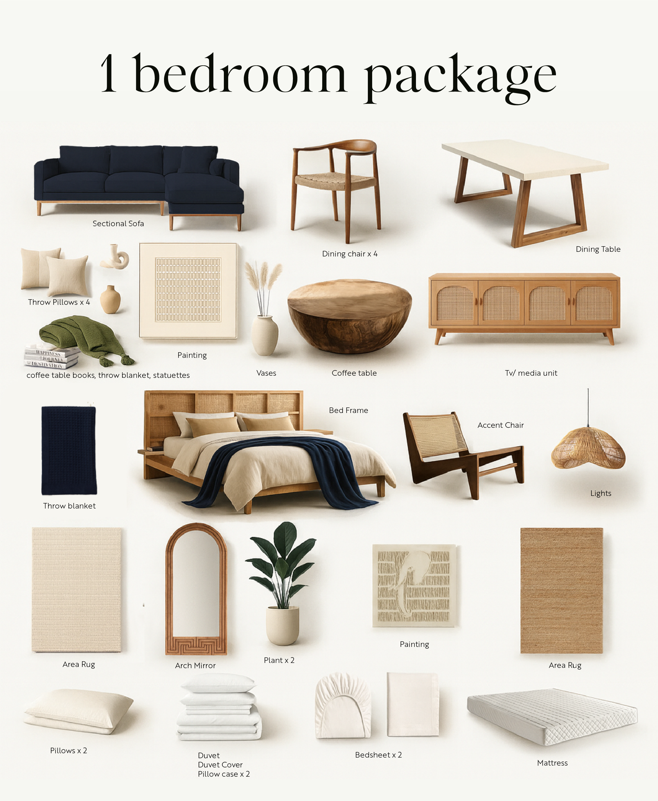 Each package is designed to make your move effortless. From furniture and lighting to linens, kitchenware, and bathroom essentials — everything you need is curated and delivered, so your home feels complete from day one.